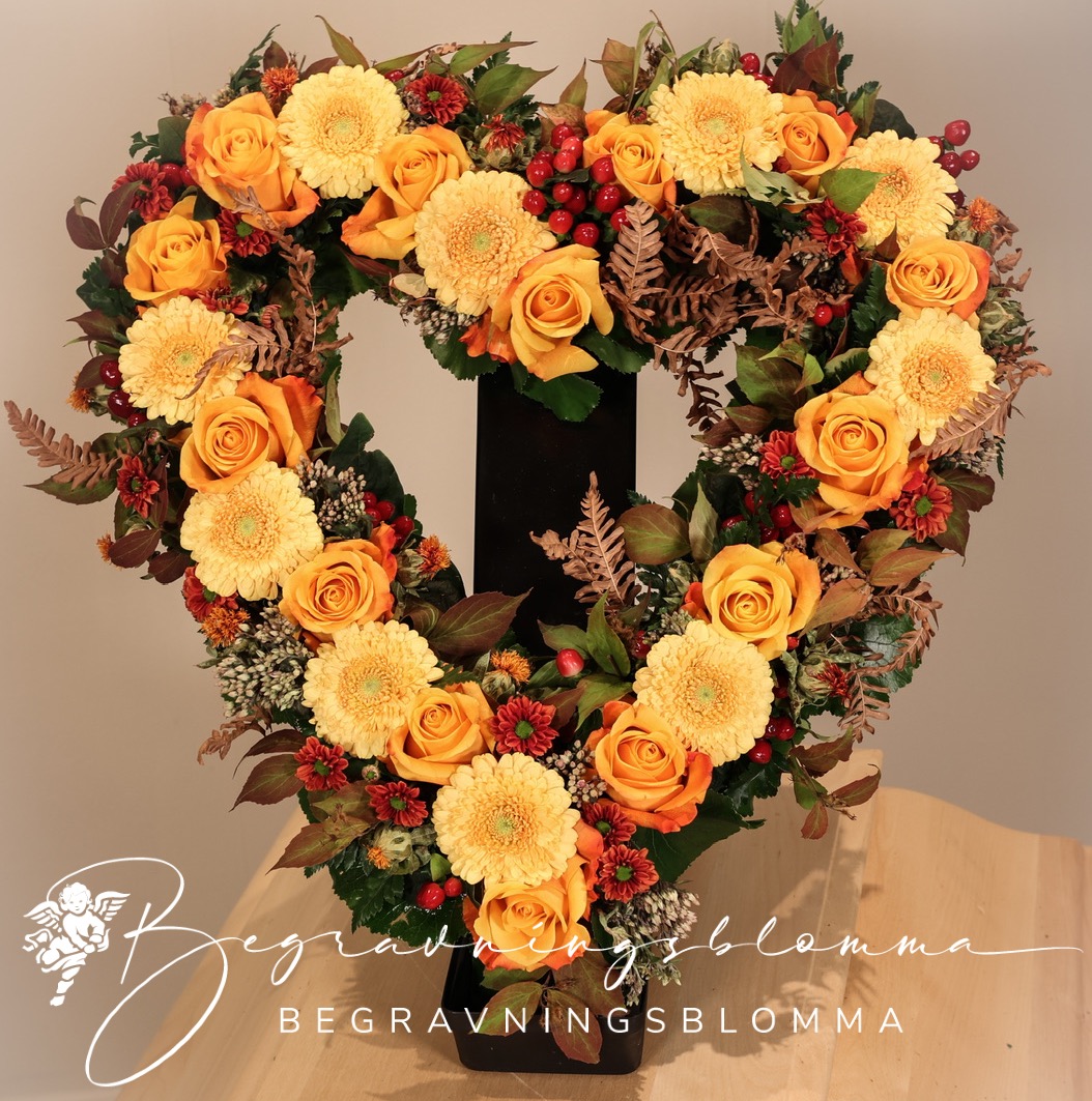 Blomsterhjärta med blommor i lejongult och höst.