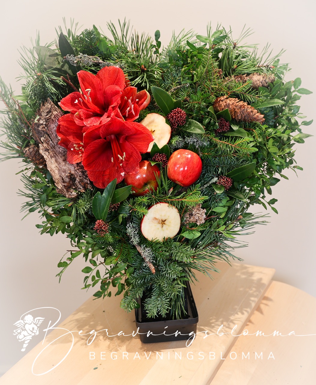 Blomsterhjärta med amaryllis olika skogsmaterial tall gran skimmia äpple.en julig känsla men amaryllis finns inte året om så då byts den ut till någon annan blomma.oasishjärtat 46 cm + blommor ca 56 cm