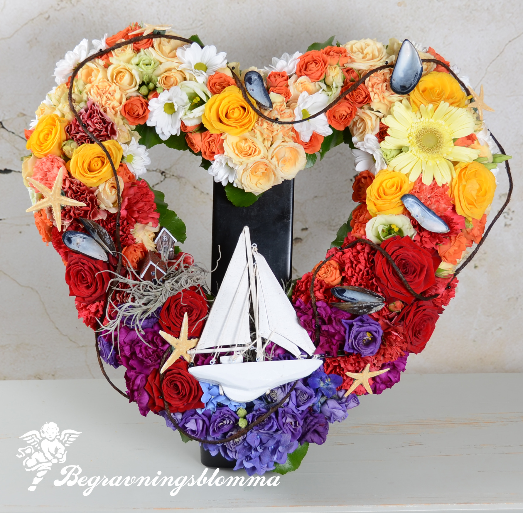 Hjärta segelbåt i solnedgång ! Ca 47x47Oasisstommen är 43×43 cmRosor kryss och delfinium mm.