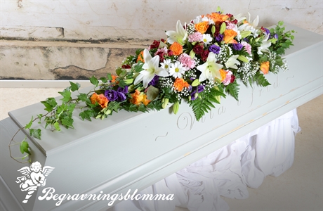 Sommrig kistdekoration i blandade färger orange röd rosa vit mm.
