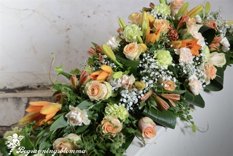 Kistdekoration i aprikos färg med rosor, liljor nejlikor mm.