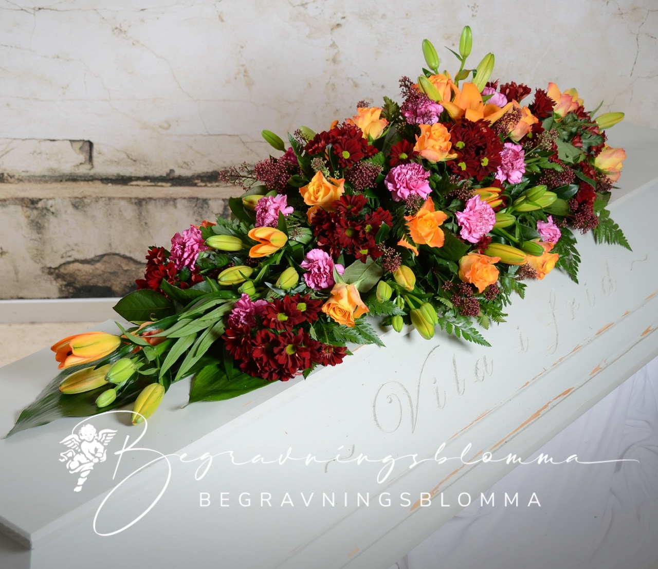 Kistdekoration i höstiga toner, liljor rosor kryssantemun och nejlika,