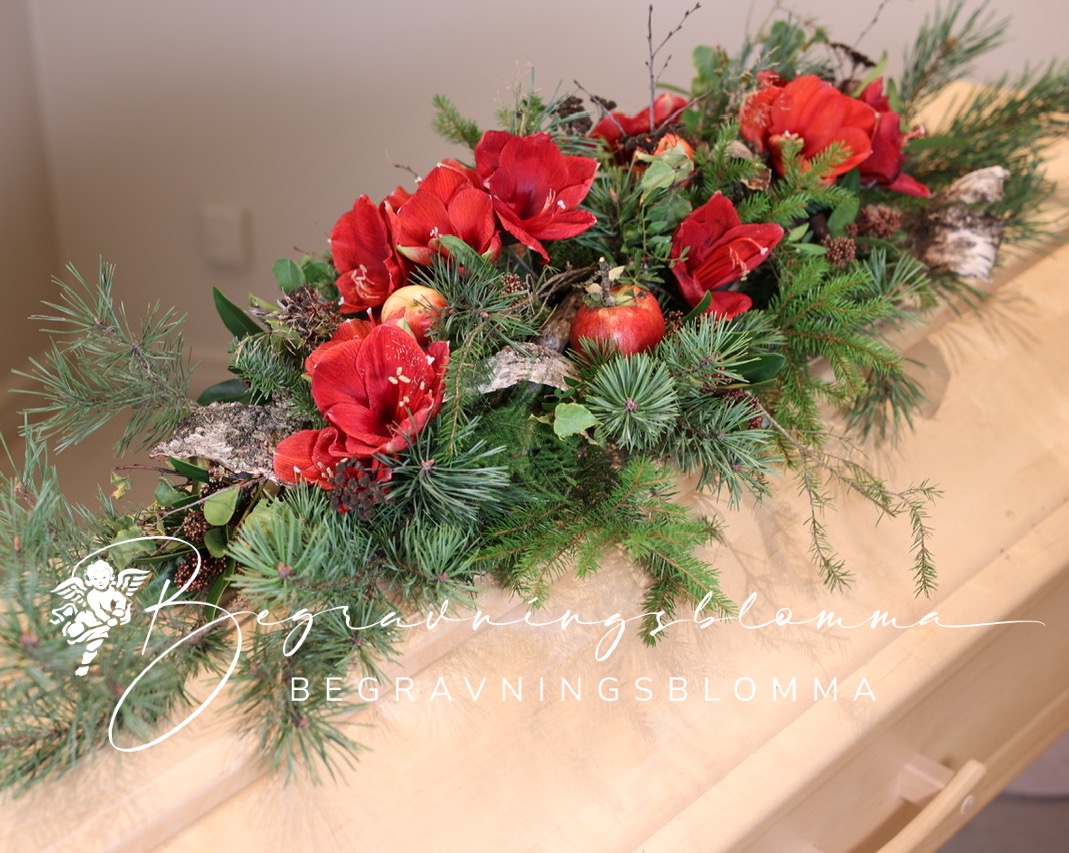 Kistdekoration med röd amaryllis och gran tall skimmia äpplen. En dekoration med julkänsla, den kan inte göras året om men amaryllis kan bytas mot andra blommor .