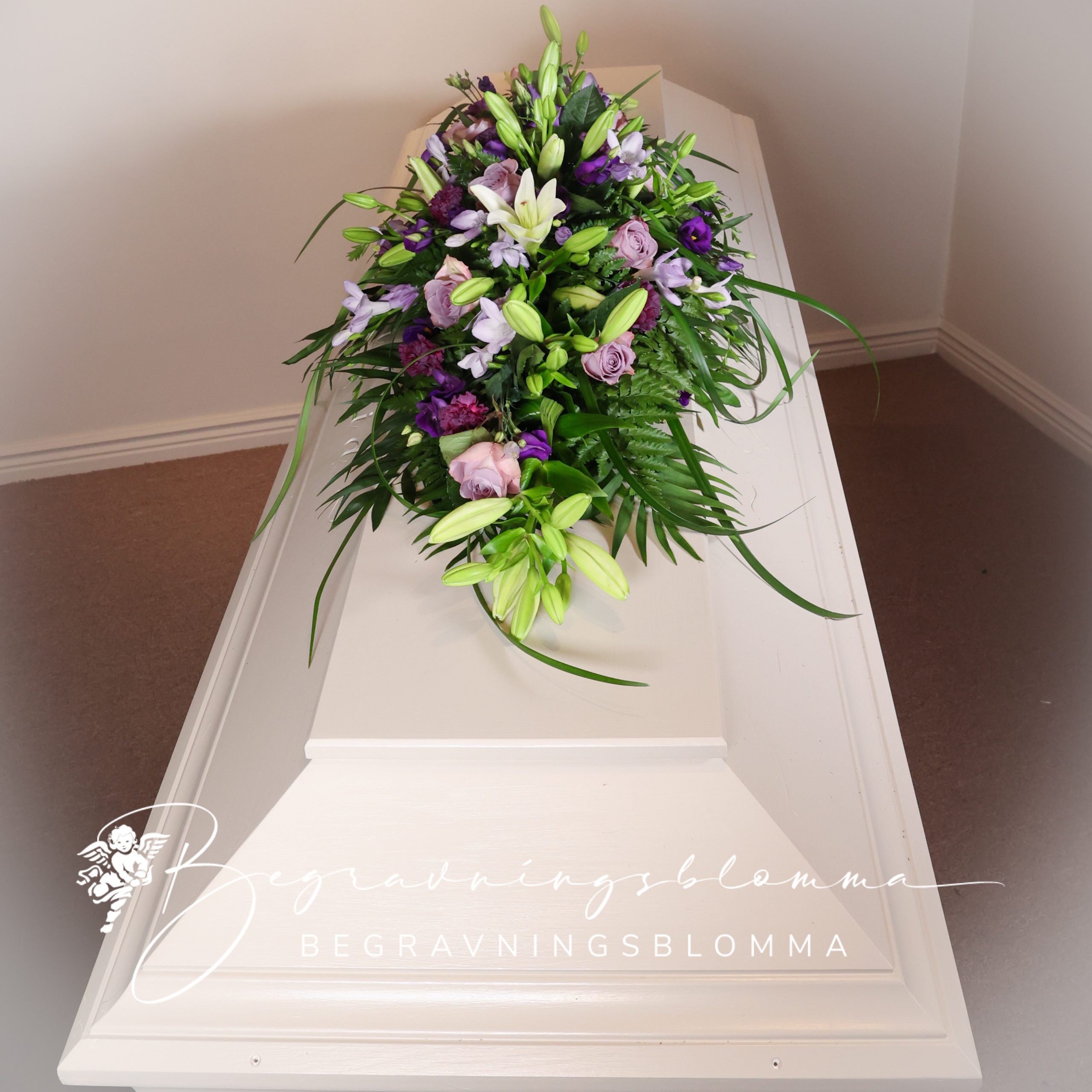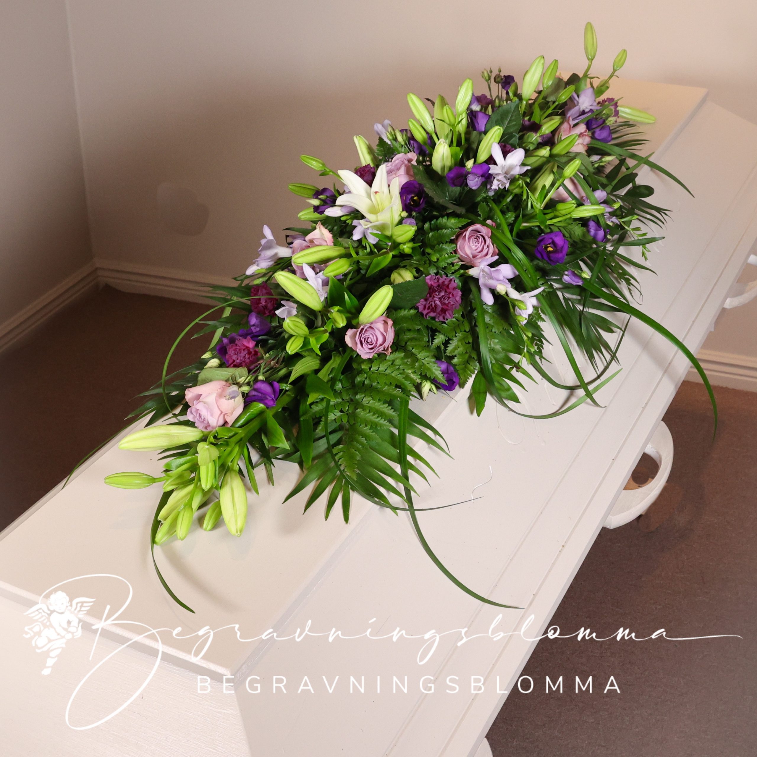 Kistdekoration med lila toner och vitt . prärieklocka liljor rosor mm.