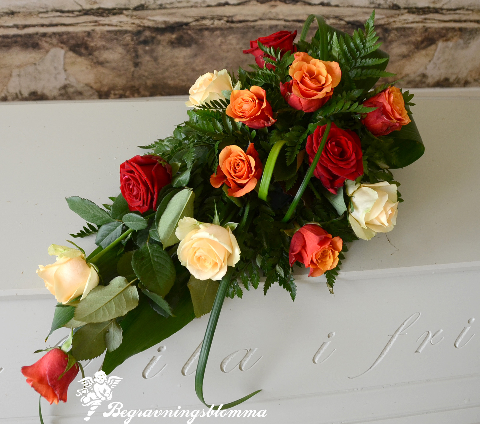 Liggande sorgarrangemang med rosor i höstens fäger,