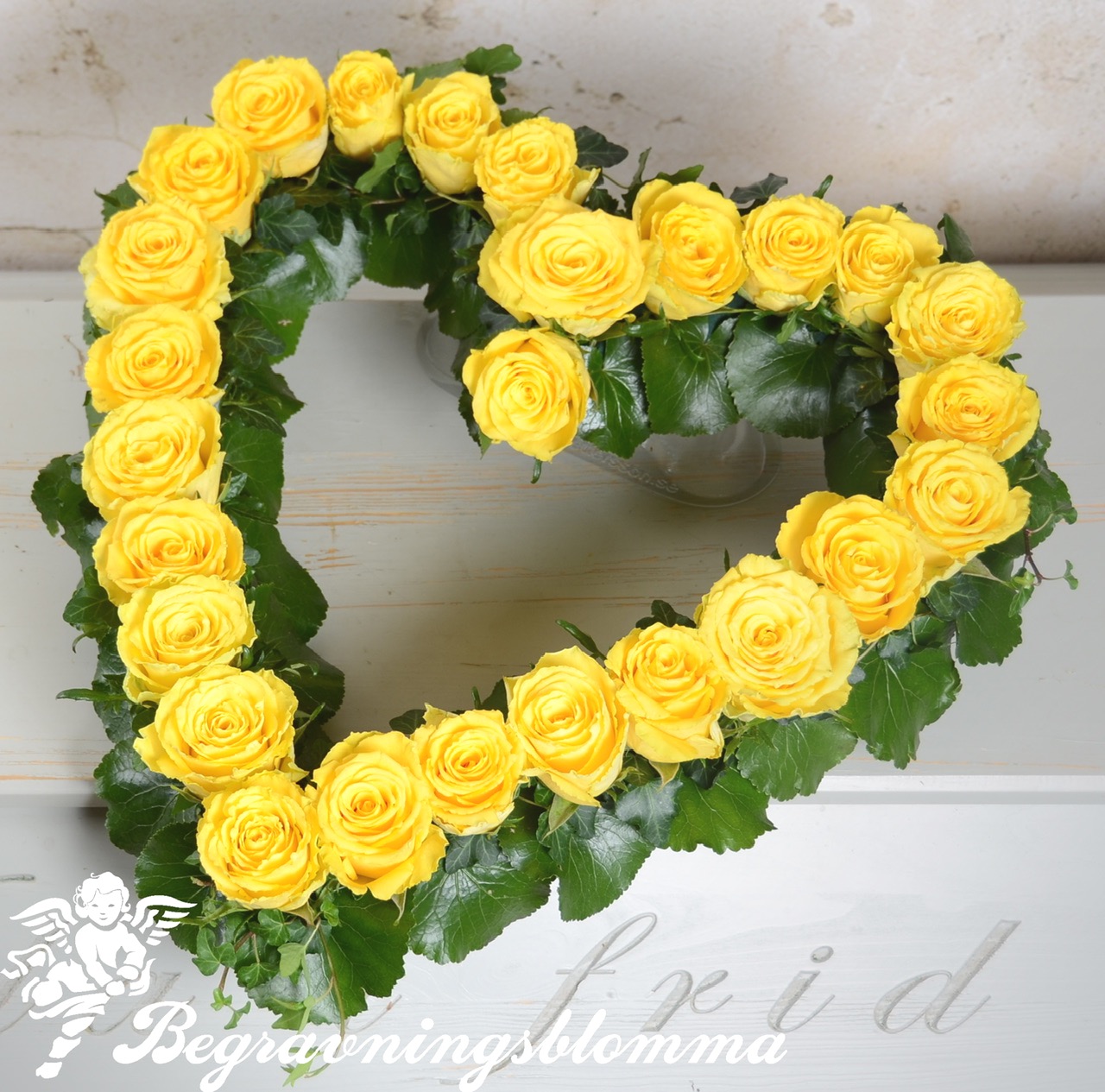 Roshjärta med gula rosor och murgröna.Stomme 43×43 cm med blommor ca 53x53cm