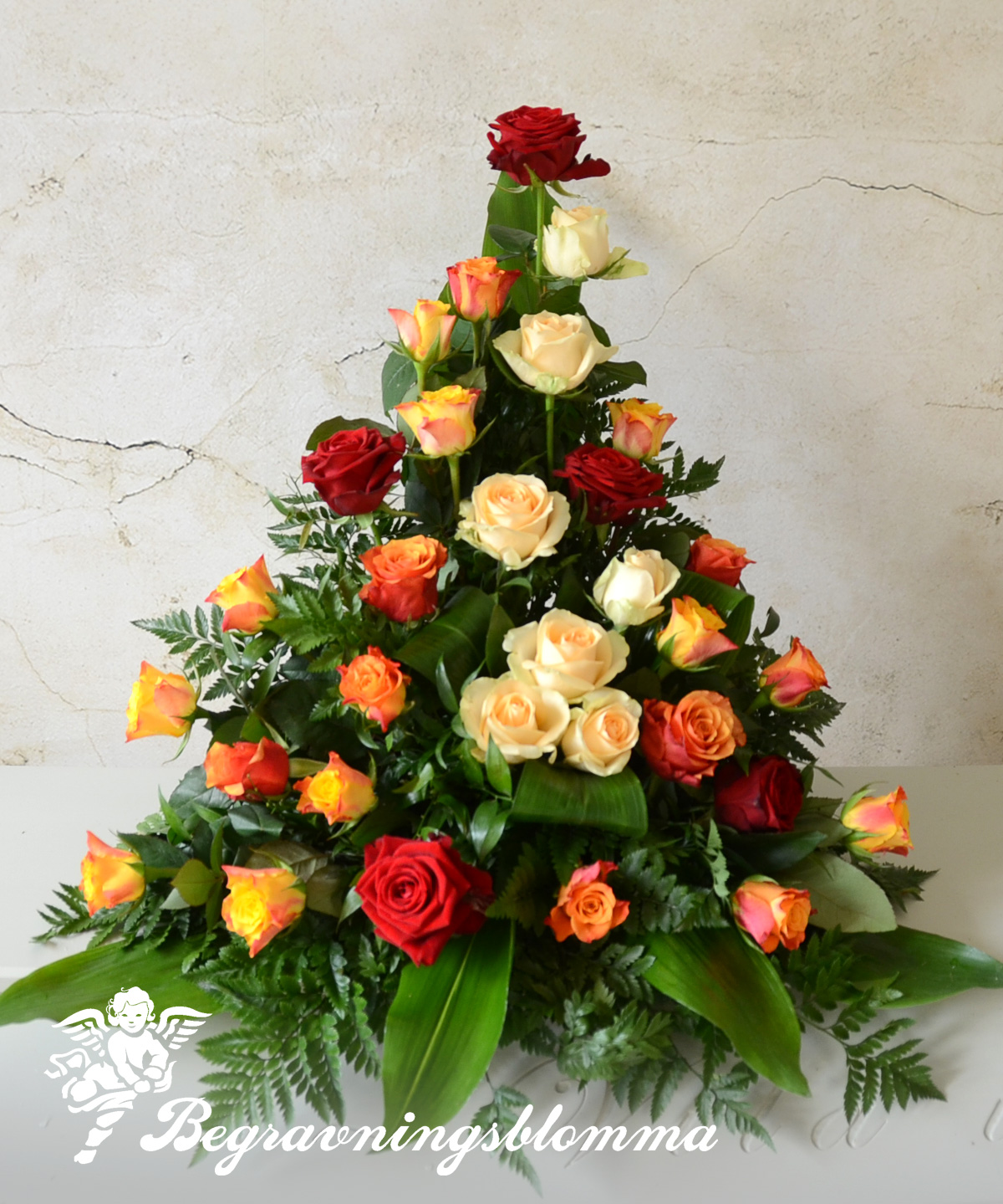 Stående sorgarrangemang i höstens färger. ca 65 cm hög
