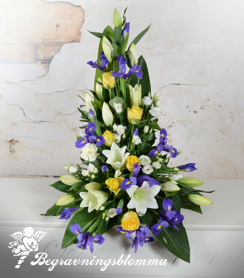 Stående sorgarrangemang med blåa gula vita toner . Ca 65 cm högt .