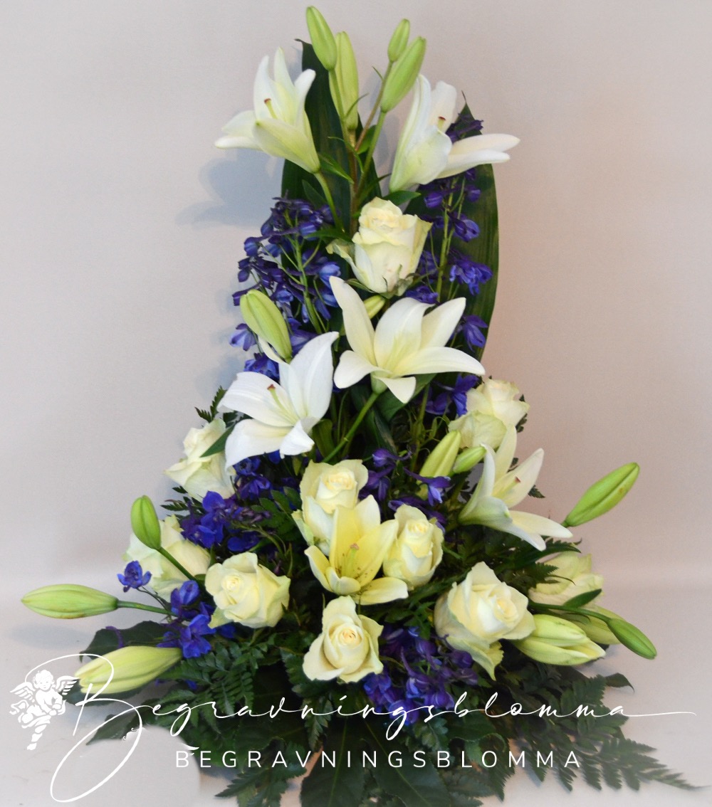 Sorgarrangemang med vita och blå blommor,rosor liljor delfinium.