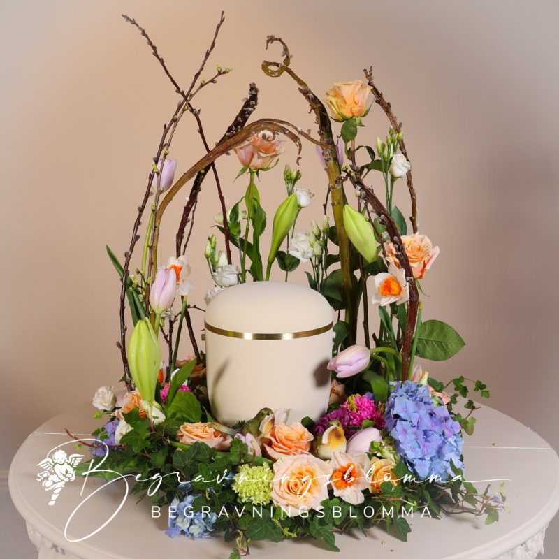 Vårig urndekoration med blommor i pastellfärger.