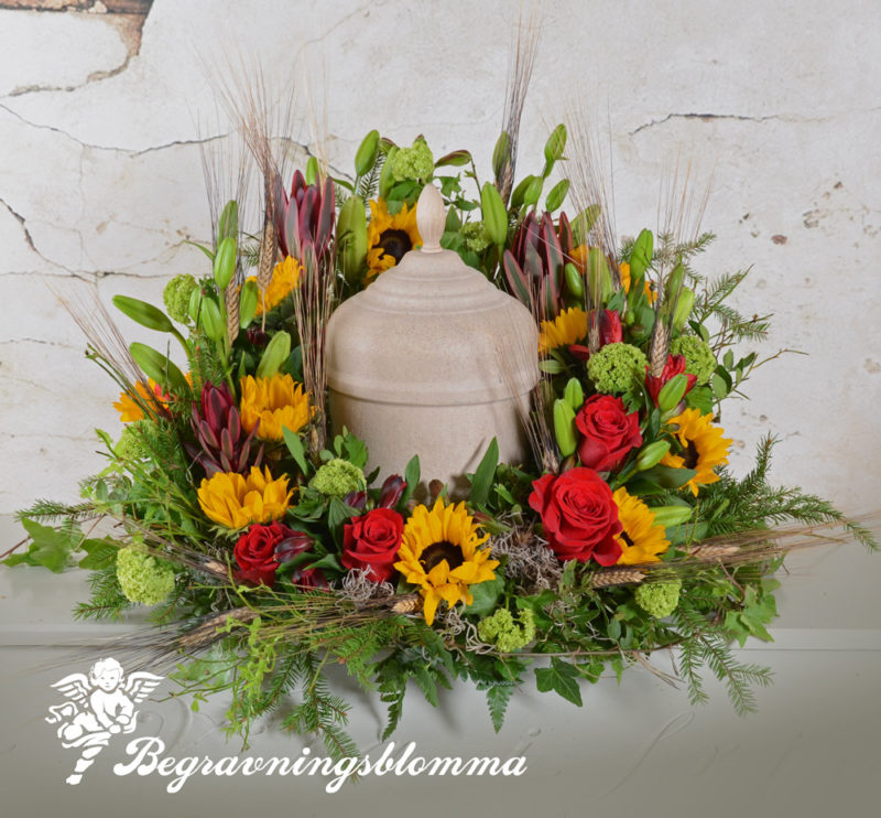 URNKRANS MED SOLROSOR RÖDA ROSOR AX MM.STOMME 36 CM MED BLOMMOR CA 46 CM